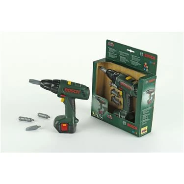 Bosch schroefmachine metΒ verschillende draaiende boortjes en schroefbitjes.Zowel rechts- als linksdraaiend. Met realistische boor en schroefgeluiden en licht.