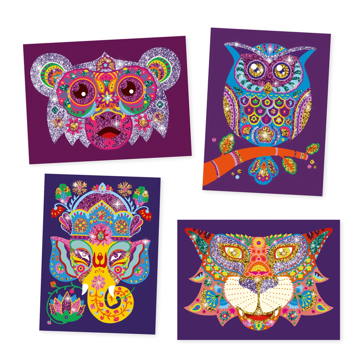 Met dit knutselpakket maak je 4 schitterende glitterschilderijtjes. Gebruik de speciale tool om de folie van het zelfklevende vakje te halen. Giet nu voorzichtig glittertjes over het klevende gedeelte volgens de kleurcodes die aangegeven zijn in het boekje. De glittertjes blijven kleven. en zo ontstaan verbazingwekkende schilderijtjes met prachtige indiase dieren.