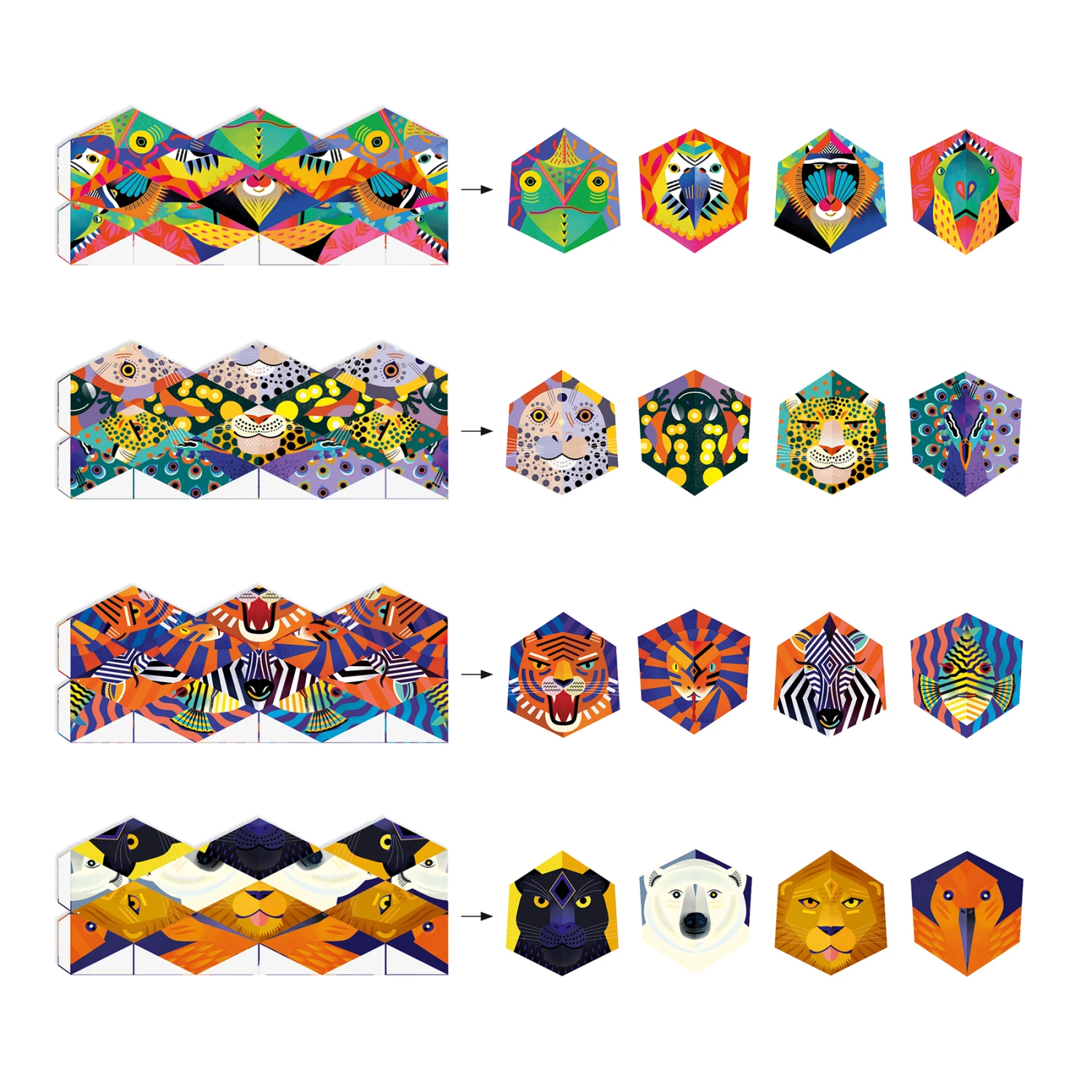 Vouw de stroken papier volgens de instructies in de handleiding en plak deze aan elkaar met de dubbelzijdige plakband. Met het draaien van het object kunnen steeds 4 kleurrijke gezichten van wilde dieren onthuld worden. Verrassingseffect gegarandeerd!