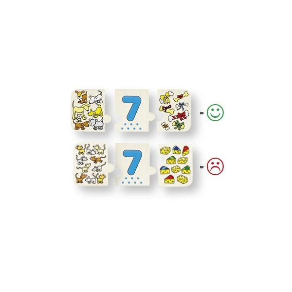 Leer spelenderwijs tellen en het begrip van hoeveelheden, door de afbeeldingen te voegen bij de getallen. Zelf corrigerend; steeds passen slechts de 3 stukjes aan elkaar die bij hetzelfde cijfer horen.