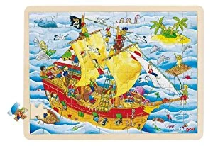 Houten legpuzzel met thema “Piraten”. De afbeelding bestaat uit 96 stukjes.