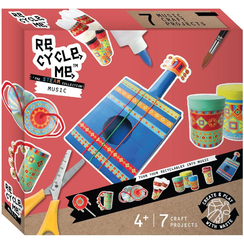 Re-Cycle-Me Steam Collection Music. Re-Cycle-Me gelooft in een wereld waarin kinderen en hun ouders zich meer bewust worden van de hoeveelheid afval die we allemaal produceren. Kinderen kunnen helpen dit te verminderen door te recyclen! Met deze leuke doos met muziekinstrument-thema kan je kleintje urenlang creatief plezier beleven! De doos bevat materialen om verschillende muziekinstrumenten te maken, zoals een gitaar en trommels. Het enige dat je uit je eigen kast nodig hebt is lijm, schaar, PET-flessen, karton, een wc- en keukenrol, blikjes en een oude cd.