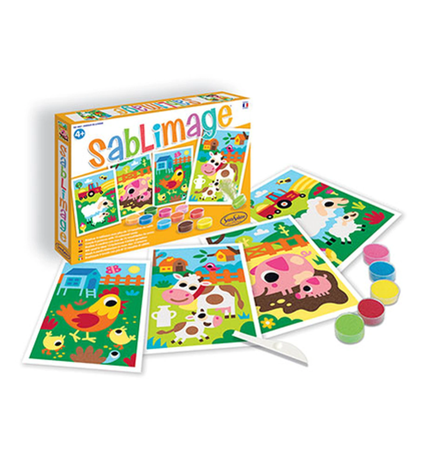 Complete materialen set om 4 prachtige Boerderij zandschilderijen te maken. Sablimage is een vrolijk en artistieke bezigheid om de creativiteit, handvaardigheid en de zin voor kleuren te ontwikkelen. Genoeg om 4 prachtige schilderijtjes te maken. Geschikt vanaf 4 jaar.
